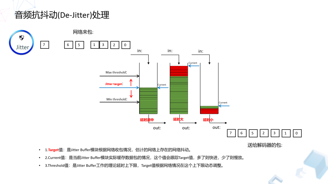 看左上角这个网络真实来包的情况,右下角则是期望通过抗抖处理送给解码器均匀的数据包,理想的包是这样顺序且均匀间隔的数据包,但现实总是不美好的,来的包总是非常不均匀,甚至几百毫秒没有数据,然后接下来突发几秒数据一起到来。这个JitterBuffer的作用就是,尽量去维持合适的数据包水位,这个水位也最终会影响到整个系统的端到端延时,水位太低或者太高都是不行的,太高的话我们及时把这个降下来,太低我们要及时把它调整到认为合理的一个位置。合理的水位可以对抗网络突发,播放端则因为Jitter Buffer能够保持合理水位,拥有稳定持续的数据源用来播放,这对于用户最终听到完整和高质量的声音都是非常有帮助的。