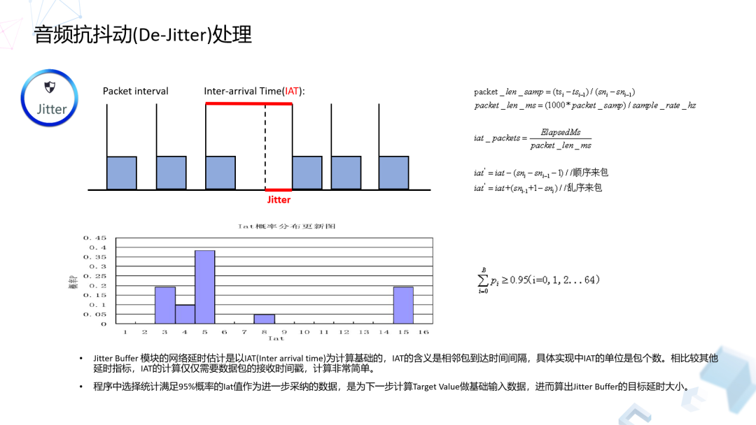 JitterBuffer通过监测什么变量去看抖动行为呢?刚才我们在网络拥塞控制那张讲的Jitter的计算,需要发送端时间戳和接收端时间戳去计算。而这里它只是通过相邻两个包到达时间的间隔,最终这个IAT(InterArrival Time)的概念去表征这个时间间隔,他表示端到端前后两个数据包到达的时间间隔,这个IAT时间间隔归一化为包个数,对一定时间区间内的IAT数据做一个概率分布,它是满足正态分布的趋势,我们取它是满足95%的概率分布作为置信区间,选取其中的最大IAT来估算当前网络的大延时。