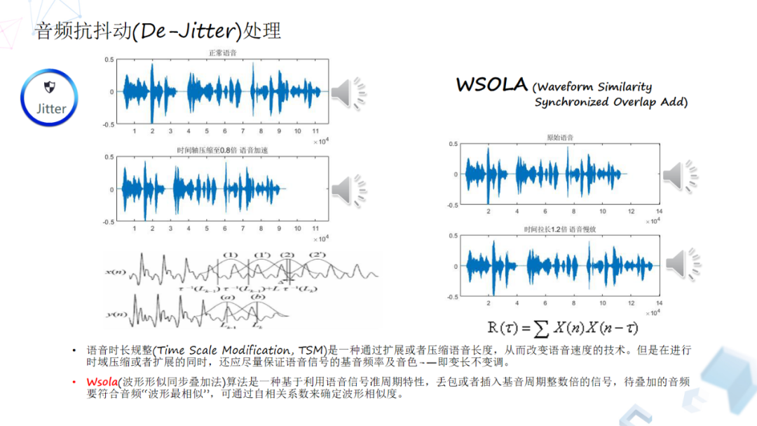 刚才讲的网络延时估计与跟踪,相当于它在对网络包进行合理缓存,保证数据的完整性。那么怎么样把已经收到的数据包延时压下来,或者让数据包水位不够的时候,把这个时间轴拉长?其实这里面也是一个Waveform Similarty的算法,我们叫Wsola,它兼顾PCM数据在幅度上,频率上、以及相位上的延续性算法,效果还是不错的。这个算法是一种基于拓展压缩语音长度,是一个变长不变调的技术,它是基于Pitch基音周期进行相似波形叠加的一个算法。