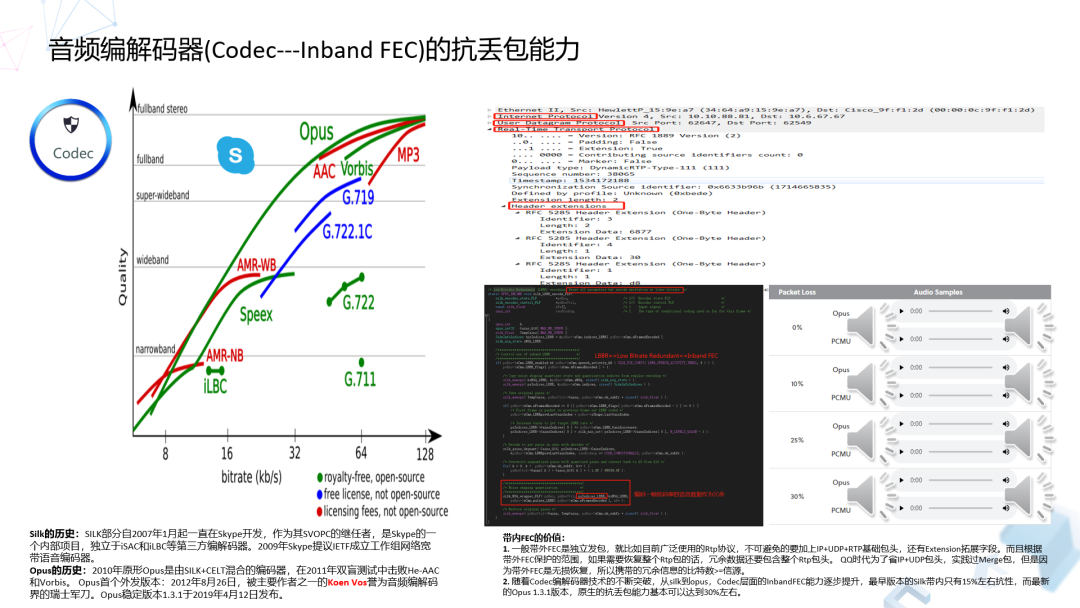 讲到这里就是大家也有个疑问,比如说silk也是t-1,然后它的抗丢包特性大概15%,而最最新版本的Opus1.3.1大家可以听一下不同丢包率场景下他的表现,Opus在内它为什么最后30%呢?