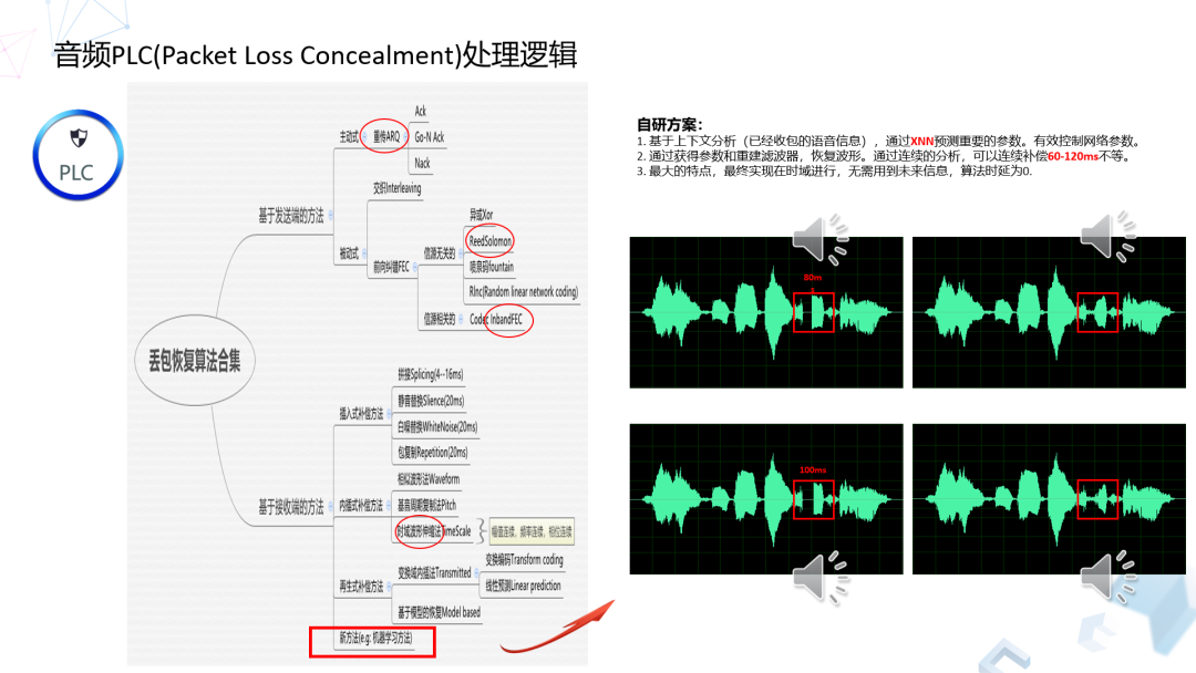 这个图就是刚才说的全家桶算法里面使用的抗丢包算法基本都包括在里面了,我们所使用的一些方法在这个合集里面只是占其中一小部分。PLC就是PacketLoss Concealment,丢包恢复算法它的内涵还是比较丰富的。画一个树状图,把整个合集集中起来发现它有两大阵营,一个是基于发端的,一个是基于收端的。基于发端的有被动式和主动式,重传类的就是主动式,前向纠错的就是被动式。