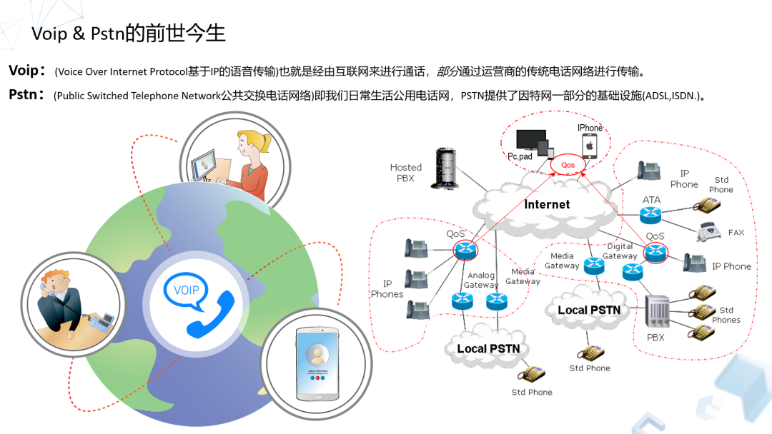 VoIP是基于IP(InternetProtocol)的语音传输,可以理解为经过互联网传输的通话,也有部分通过电信运营商的传统电话网络进行传输。VoIP网络通话是电脑或者移动终端之间的互通,比较典型的QQ或者微信,以及苹果设备之间的FaceTime。VoIP比较便宜,这是因为VoIP不过是一种互联网应用,那么这个流量用户来看视频,还是用来做语音视频通话,实际上资费是一样的。