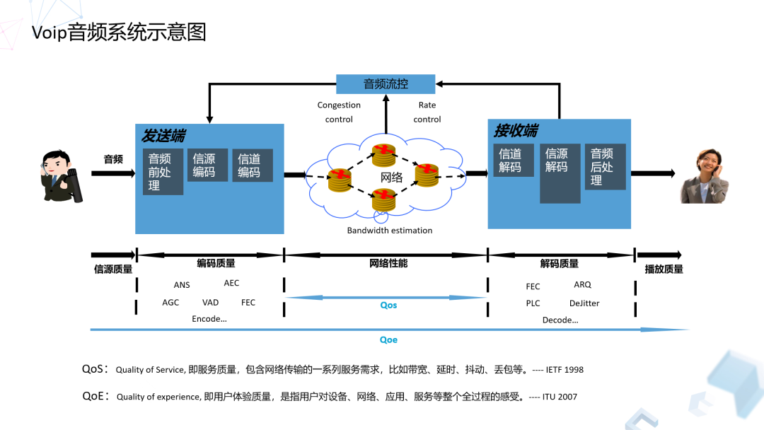 VoIP从发送端到接收端大概有哪些模块呢?我今天着重讲网络的流量控制、拥塞控制,包括丢包、抗网络抖动的一些逻辑,以及他们怎么样融合才能更好提升服务质量。核心是QoS的概念。