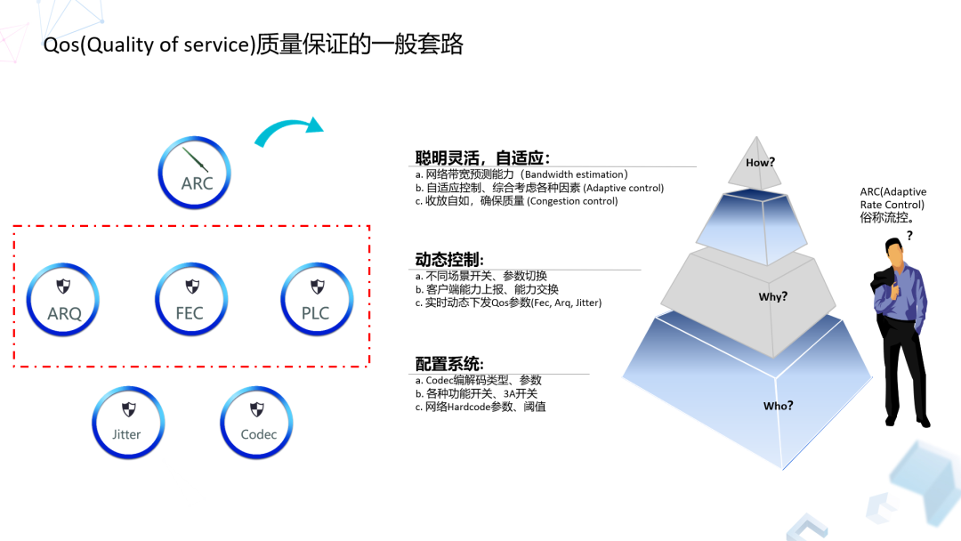 QoS没有太多秘密,无非就是抗丢包,抗抖动,网络拥塞控制等等,ARC(Adaptive RateControl)可以看做一个中央指挥官,它只能去指挥整合这些方式、手段,最终保证音频质量是良好的改动。所以说到这块,QoS一般套路就类似于一个全家桶,无非这六种模块的合理有机组合,接下来会对这几块深入讲一下。
