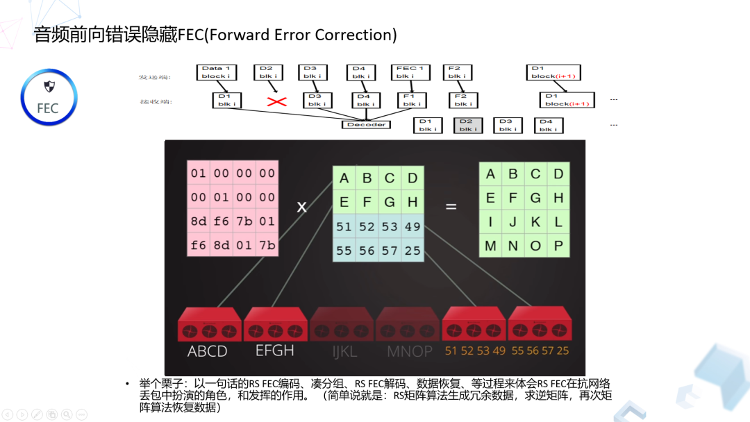 FEC(Forward Error Correction)实际上没有太多新意,这块无非就是利用其基本的特性。比如分组划分,接收端恢复不受数据包顺序影响等特征。举个例子:如果是分组是4,那么在网络传输过程中任意丢掉一个,在接收端任意收到任何顺序的4个属于本分组的数据包,那就可以把丢失的包恢复。