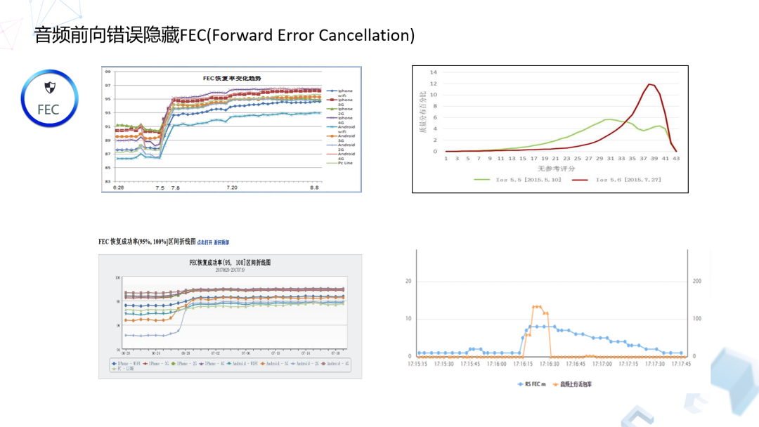右上角是大盘的数据,可以发现FEC整体会有明显攀升,这里就是常态FEC的一个效果。另外对于在这里的分组长度的确定,分组要兼顾整个系统延迟,以及你的系统规格要兼顾怎样的边界和指标,如果不通过大数据运营,你永远不知道分组多少是合适的。通过前面讲的大数据ABTest运营方式把数据放在真实用户的全网进行验证,找到合适分组、冗余倍率公式、控制相关的策略。下面这两张图就可以看到最终的结果,看似还是很不错的,FEC恢复率从95%恢复到高的接近99%。