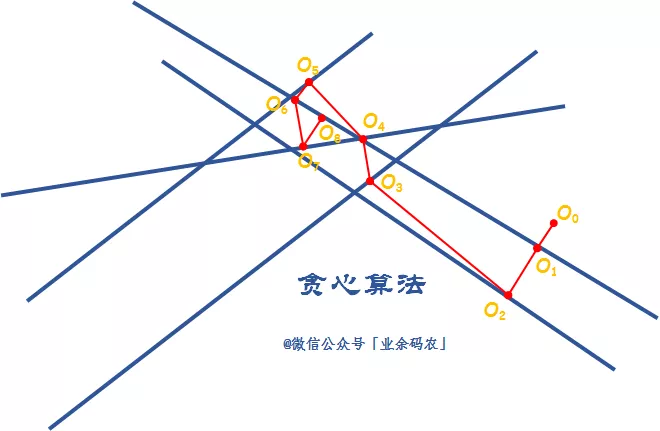 这个图表示的是对多条直线的交点进行求解。很显然,上图中的直线是不存在统一交点的,但是可以通过算法求得统一交点的最优解。若是采用贪心算法,那么在进行迭代时,每一次都会选择离此时位置最近的直线进行更新。这样一来,在经过多次迭代后,交点的位置就会在某一片区域无限轮回跳转。而这片区域也就是能得出的大致的最优解区域。