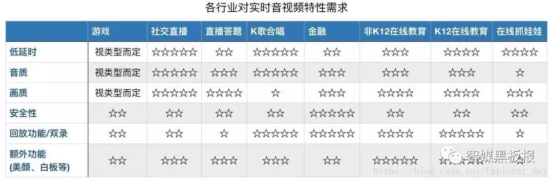 伪实时:视频消费延迟超过 3 秒,单向观看实时,通用架构是 CDN + RTMP + HLS,现在基本上所有的直播都是这类技术;准实时: 视频消费延迟 1 ~ 3 秒,能进行双方互动但互动有障碍。有些直播网站通过 TCP/UDP + FLV 已经实现了这类技术,YY 直播属于这类技术;真实时:视频消费延迟 < 1秒,平均 500 毫秒。这类技术是真正的实时技术,人和人交谈没有明显延迟感。QQ、微信、Skype 和 WebRTC 等都已经实现了这类技术。对于严格的音频通话,当延时低于200ms时,就会影响到用户体验。达到400ms对方用户就容易感知出来,1s以上的延迟对于交互式实时直播就不能接受了。下面有一个表格基本列举了不同业务对于低延时的大致要求,当然即使是同一个业务,应用在不同的场景下对于低延时要求也经常不一样,这就导致我们解决问题的技术手段也是不一样的。在视频监控业务下这种差异更大,对于一些司法、监狱和博物馆,实时性要求很高,希望出现问题后立即能进行报警和进行查看,但是对于一些景区直播和学校社区实时性的要求就低很多。