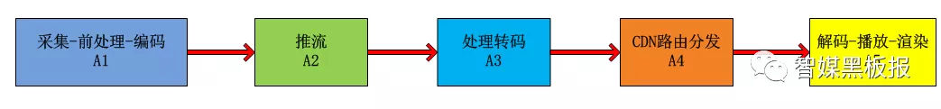 设备端的延时:包括数据的采集、前处理、编码、解码、渲染等处理阶段花费的时间。也就是A1和A5花费的时间。
