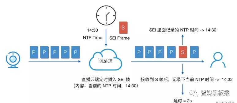 我们也可以在编码端的视频帧前面加上SEI帧,SEI的全称是补充增强信息(Supplemental Enhancement Infomation),提供了一种向视频码流中增加额外私有信息的方法。我们可以隔一段时间就在I帧前面的SPS PPS后面增加SEI帧,私有信息就是这时我们编码器的NTP标准时间,当该SEI帧信息到达播放器端,我们再计算下本地的NTP时间。这样本地的值减去SEI的NTP时间,就是当前系统的延时。前提条件,编码器和播放器进行过NTP校时,保证毫秒级别的时间信息要一致。