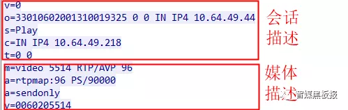 会话描述和媒体描述,一般会话级描述从v=开始一直到第一个媒体描述为止,媒体描述是从m=开始一直到下一个媒体描述m=的位置之前。也就是说SDP里面一般先从会话信息v=开始,然后后面跟几个m=的媒体描述组成。