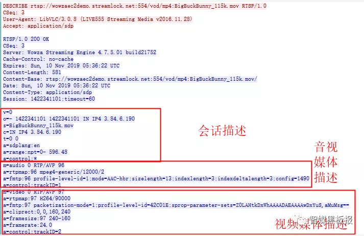 解释:这里面包含一些RTP封包模式,视频质量等级,视频的SPS、PPS等信息。