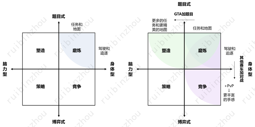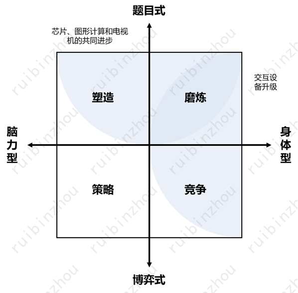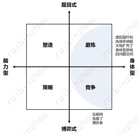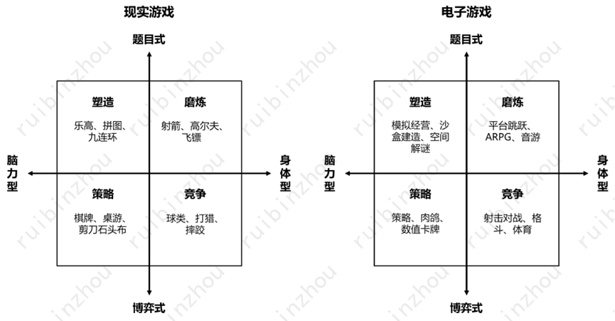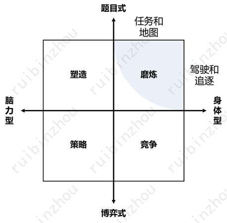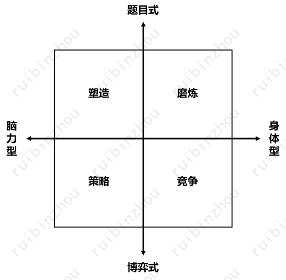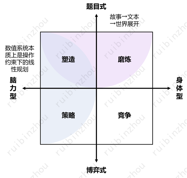 简单来说,生成问题和解决问题各有两个基本方面。于是两大维度加四个方面,合起来形成了四种基本的、和“鲁粤川淮”四大菜系一样的基本游戏形态——这些基本形态下面又要演化出种种更细分的形态,以及相互借鉴融合的形态,但万变不离其宗。
