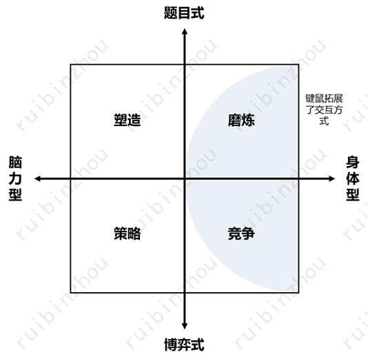 博弈式:游戏工具本身不包含问题,需要玩家基于工具特性,实时地、相互地设计问题并解决问题的,称为博弈式。