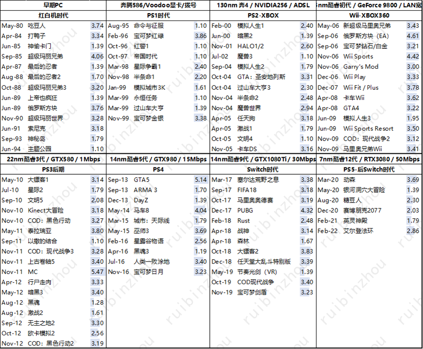 电子游戏史和电子游戏产业史分析很大程度上是关于历史头部游戏的分析——这些头部游戏无一例外代表着最先进的产品形态,也往往占有绝大部分市场份额。手机平台的头部游戏想必大家已经非常熟悉了;这里补充一张80年代以来PC、主机的头部游戏总表,作为下文讨论的参考。由于空间有限,一些知名头部游戏不在表上,比如神秘海域、刺客信条、FIFA等等,但不影响讨论。
