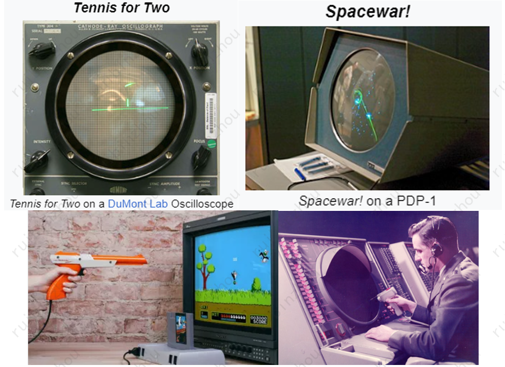 由美国军方主导的一系列技术项目的快速进展,是电子游戏形态突破的主要原因。_Tennis for Two_的设备本来用于显示弹道_SpaceWar!_使用的电脑PDP-1则集成了当时比较先进的图形显示技术、算力技术和交互技术——这些技术的最初目标是为北美雷达监测系统提供算力和可视化的操作/信息展示界面。值得一提的是,在电子游戏的最早期,鼠标、手写板、摇杆、光枪等交互设备已经在军方的计算机系统普及开来——目的是操作屏幕上的战场信息。