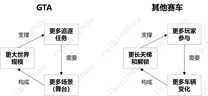 这个方向的飞轮构筑可能类似于《GTA》或《塞尔达》系列,但更加平滑和可持续。玩家体验到的虚拟世界内容,例如虚拟城市中行人的种类、街区的发展,或游戏中的物理效果更新等等,不再依靠几年一个周期的版本进行更新,而是由AIEGC逐渐地补充到游戏当中。在一个好的底层程序构架基础上,AI能力的发展能够持续容纳这类AIEGC驱动的游戏虚拟世界完善过程。随着虚拟世界不断完善,玩家将体验到越来越多的涌现式内容,并产生基于沉浸感的粘性——这种粘性是长期付费的重要支撑。
