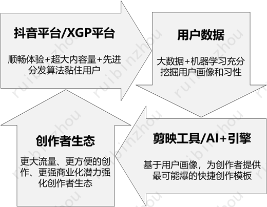 · 最终,形成一个类似于抖音→剪映的、基于AI数据挖掘形成的UGC分发→创作闭环生态。