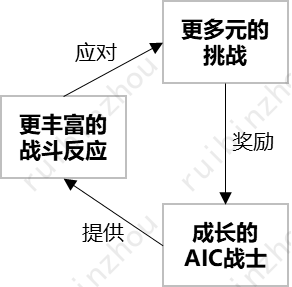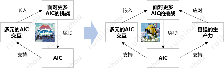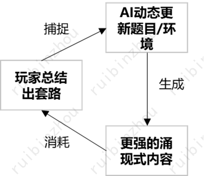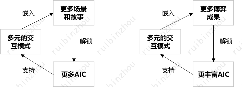 左侧是面向题目式游戏的AIC飞轮。基本思路是将AIC及其相应的交互模式一个个嵌入场景,随着题目解答的进度顺序解锁。右侧是面向博弈式游戏的AIC飞轮,解锁顺序是博弈成果,例如积分、货币、或战利品等等。