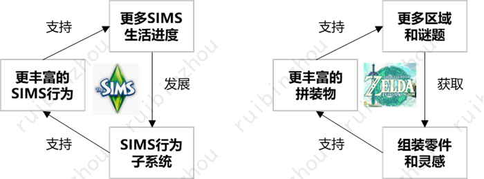 以《SIMS》和《王国之泪》举例——两者都是典型的塑造型游戏,拥有一组具备混沌效应的底层数值和动作系统,支持NPC或自制工具的活动。对《SIMS》来说(尤其是3代之后),随着游戏进程推进,玩家可以为游戏中的SIMS小人解锁越来越多的性格、梦想、人际关系、职业发展、兴趣爱好等等,而每个系统的发展都会带来更丰富的SIMS小人活动逻辑,让游戏内容的涌现性更强,前往下一个阶段的过程变得更有乐趣。对《王国之泪》来说,自搭工具对应着《SIMS》当中的SIMS小人,各个工具的零部件则类似SIMS小人的子系统,操纵工具挑战关卡类似于让SIMS小人实现一个又一个梦想——虽然游戏形态大相径庭,但两者的飞轮结构是基本相同的——那就是利用极其先进的某种编程技术使得诸多系统模块能够很好地耦合在一起,从而使得诸多系统的交相作用能够形成涌现式的内容,再把这些支持涌现式内容的子系统分散于游戏的各个进程或区域当中。