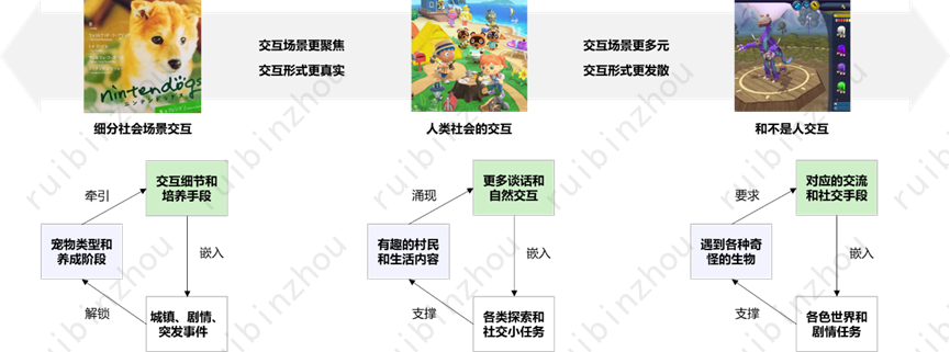 AIC驱动的“非人类逻辑反应”模块已经在其他游戏中有雏形。典型如《任天狗》和《孢子》——这两款游戏的基本问题结构就是:非人NPC有自身的行动逻辑→玩家理解逻辑并行为→获取NPC正面反馈。这些模块在过去的NPC行动构建方式下通常是比较简单的,根本原因是人很难完全理解或充分想像非人生物究竟会如何行为——新一代AGI通常具备比较强的发散思维和临场反应能力。