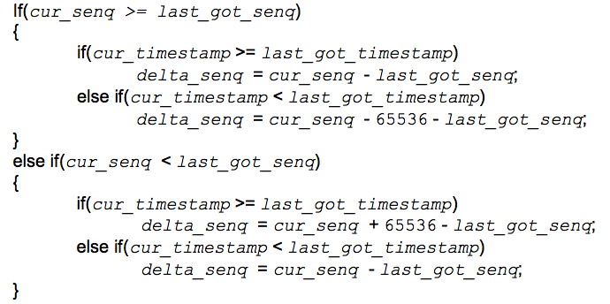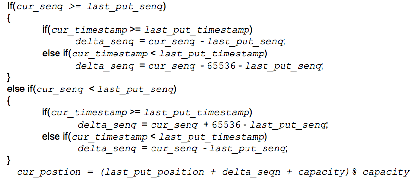 接下来看怎么把包放到正确的位置上。对于收到的第一个包,它的位置(position,范围是0 ~ capacity-1)是sequence number % capacity。后面的包放的position依赖于它上一个已放好的包的position。设上一个已放好的包的sequence number为last_put_senq,timestamp为last_put_timestamp,position为last_put_position,当前收到的将要放的包的sequence number为cur_senq,timestamp 为cur_timestamp,position为cur_position,当前的包的sequence number与上一个放好的sequence number的gap为delta_senq,则cur_position可以根据下面的逻辑关系得到。