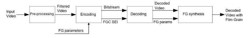 图1: 视频编解码框架中的胶片颗粒参数化与合成框图