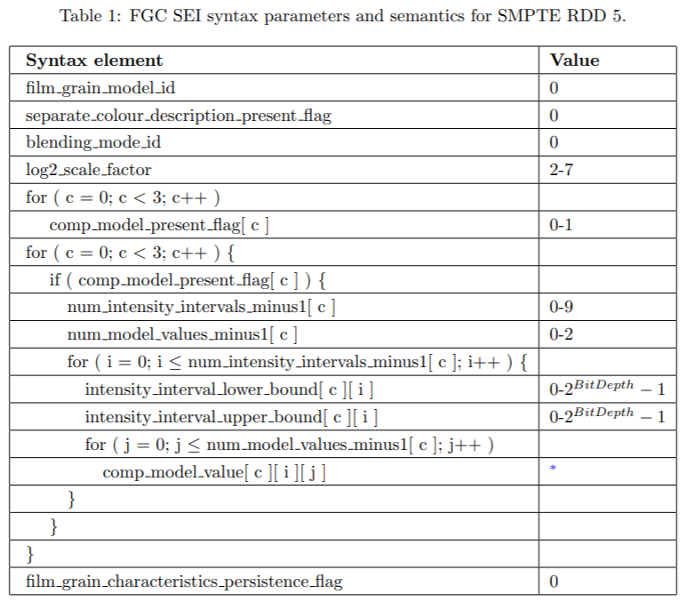 表1: SMPTE-RDD5 中的 FGC SEI消息语法参数原语