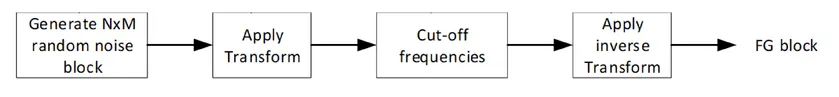 在 SMPTE-RDD5 中提供了对胶片颗粒合成部分(位于视频分发链的解码器端)的更深入的介绍。尽管它是为 H.264 标准定义的,但 VVC不需要修改,因为两者都支持相同的元数据。只需稍作修改即可支持高于 8 位的位深度,它使用比 VSEI 规范中描述的更精确的胶片颗粒合成过程规范。此处描述的模型基于频域滤波,包括随机噪声的滤波以模拟胶片颗粒图案。通过该模型,胶片颗粒图案通过使用定义低通滤波器的一对截止频率在频域中建模,图案随后被缩放到适当的强度,然后最终将其混合到图像中。