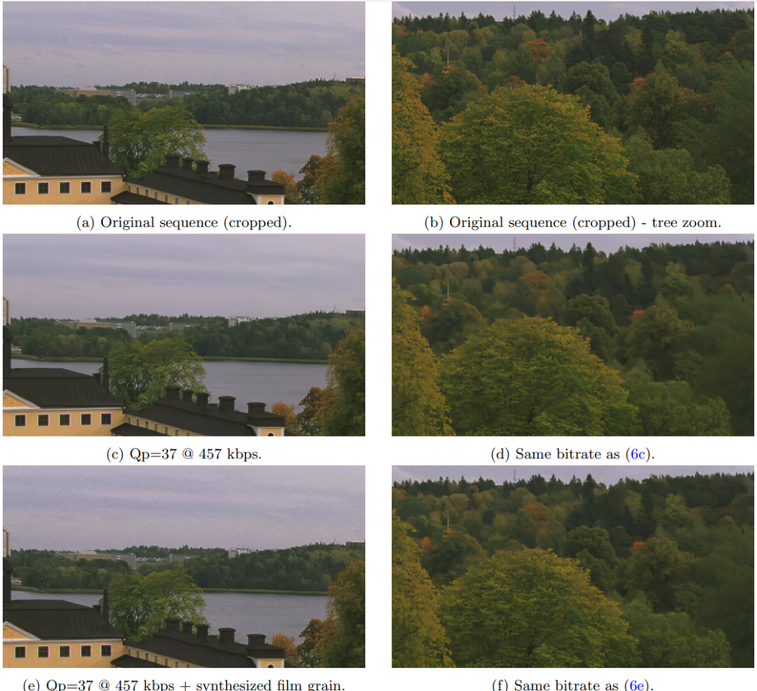 在另一组测试中,我们旨在展示胶片颗粒掩盖压缩伪影的能力,例如,参见图7b、7d 和 7f。众所周知,VVC 倾向于通过过滤掉高频细节来平滑视频帧(导致主观质量降低)。胶片颗粒可用于对视频进行轻微的重新噪声处理,从而掩盖某些压缩伪影,增加对视频质量的主观评估并增强视觉外观。因此,图7 还说明了胶片颗粒在视觉上掩盖了在没有胶片颗粒的重建图像中存在的强压缩伪影的能力。例如,注意树上的平滑区域(图7d),胶片颗粒能够掩盖细节的损失并掩盖平坦的平滑区域(图7f)。据观察,胶片颗粒能够恢复非常失真的画面的鲜艳度。
