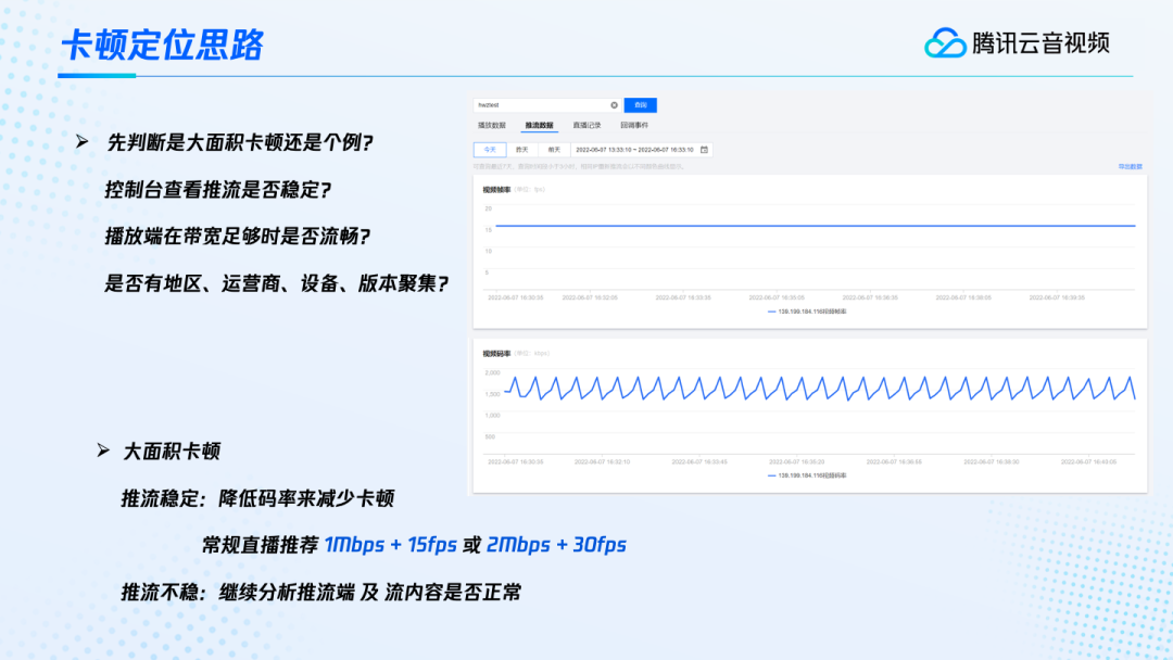 如果我们定位后,认为存在大面积的卡顿。这个时候我们再来结合右侧的图辅助看一下推流端是否稳定。假如推流比较稳,但存在大面积卡顿,我们推荐可以用降低码率的方法来减少卡顿。常规的直播一般采用1Mbps的码率加15fps的帧率或2Mbps码率加30fps的帧率就可以了。除非是一些特殊的活动,或者对高清有特别需求的,码率可以再高一些。但帧率的话,30fps基本上就够了。
