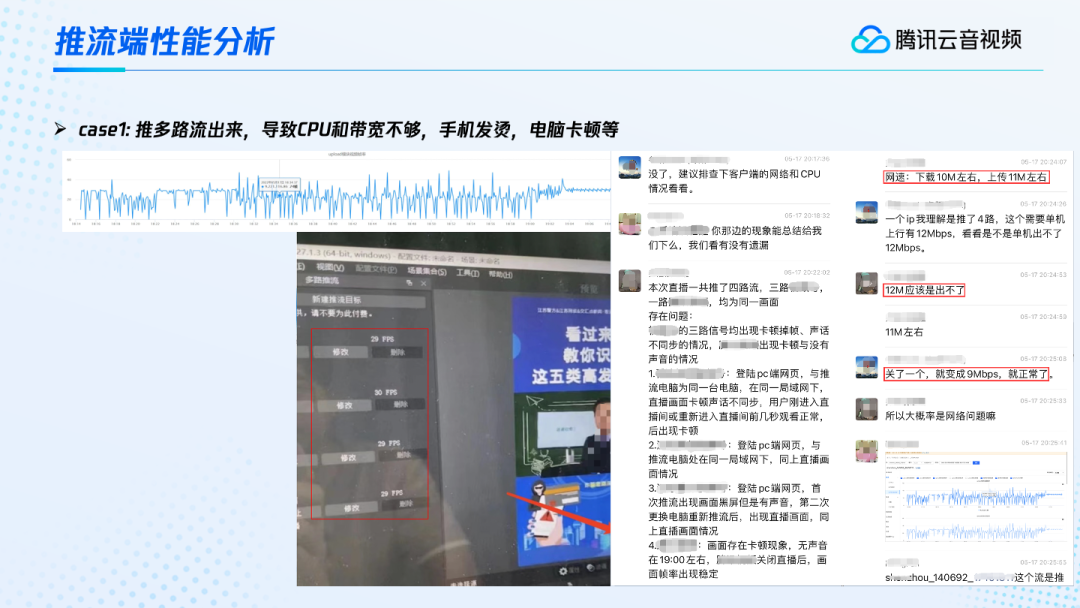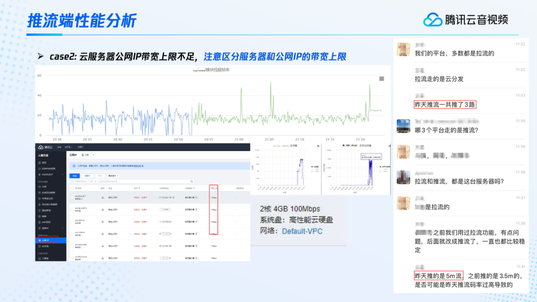 比如说上面这个案例,我们在服务端看到,接收到的帧率很不稳定。经过各种的沟通,用户反馈也是推了三路流,同时每路流的码率都比较大。之后经过反复的沟通和定位,我们终于发现用户使用的云服务器的公网IP出带宽比较小,所以超过了公网IP的出带宽的上限,即这个带宽已经跑到了平峰,甚至还有很多被丢弃的出流量,这样就造成了视频的卡顿。像这种在服务端定位是比较困难的。因为这个用户的云服务器也在腾讯云上,所以我们联合云服务器以及公网IP的同事共同进行定位,才发现了这个问题。通过这个案例,我们在购买云服务器时一定要考虑到它的公网带宽上限以及公网IP的一个带宽上限。比如这个案例中,用户反馈他购买的时候,云服务器显示为两核四G上限一百兆的出口带宽。但是出口同时需要绑定一个公网IP,在用户反复的进行公网IP绑定调整的时候,最新公网IP的出口上限其实就没有那么大了。所以我们在购买云服务器时要注意这个公网带宽上限,同时也要注意绑定公网IP的带宽上限。