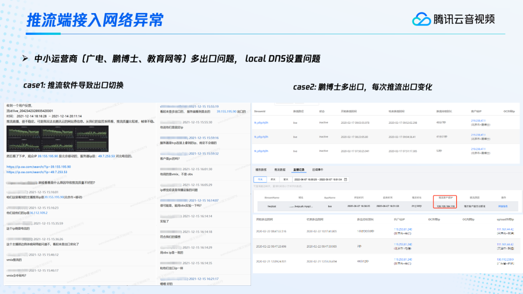 除了带宽的限制,我们还常常会遇到一些接入网络的异常,一般是中小运营商多出口或者localDNS设置异常问题。中小运营商是租借的三大运营商的出口。有时候为了自身的成本考虑,它们会在各个出口之间进行调度。这时就有可能出现跨运营商的情况。上面左边的这个案例,用户他在推流时发现比较卡顿。我们定位后发现是因为存在跨运营商接入的情况。用户看到自己的出口是北京移动,但我们看到的却是北京电信,出现了跨运营商的情况。最终定位下来发现是由于用户使用了一个叫做vmix的推流软件,不是OBS。用户在vmix中的一些设置可能修改了DNS或者使用了VPN等等,就导致出现了跨运营商。但我们用OBS进行试验,发现它的IP出口其实是一致的。右边这个案例,用户使用了中小运营商,他每次推流的时候,过一段时间出口的IP就会不停的变化,服务端接收的运营商也会不断的变化。有的时候,在变化中出现前次变化和中间推流出口不一致的情况,就形成了跨运营商,从而导致这卡顿。