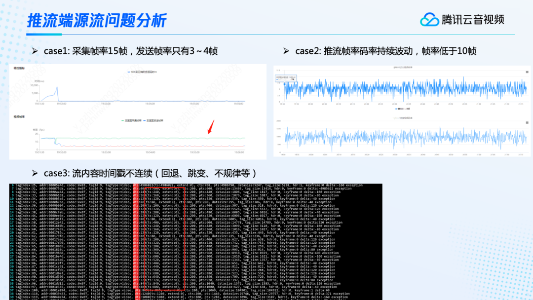 比如说上面的这几个例子。第一个采集帧率是15帧,但是发送帧率只有3-4帧,这样子的话播放肯定会卡顿,因为帧率实在太低了。我们可以通过客户端的监控看到,开始有一段时间客户端探测到的RTT非常的大。于是客户端为了适应这种大RTT,就自动降低了推流的帧率。但是后面却没有恢复回来,导致持续的用3-4帧来进行推流,造成了卡顿。第二个则是推流的帧率码率持续的进行波动,很不稳定,而且它的帧率很低,都低于10帧。像这种案例,我们就必须要结合客户端的日志来查看当时推流的情况,以及CPU等的占用率情况。还有一些例子是流内容的时间戳不连续。第三个图我们可以看到帧率、码率都挺稳的,但是它的时间戳不连续,反复的进行跳变。这里我们的服务端用ffprobe进行查看,可以看到时间戳忽然跳大,然后又跳小,反复抖动。时间戳的不连续,最终在播放端就会导致播放器无法正常播放,产生各种卡顿的现象。