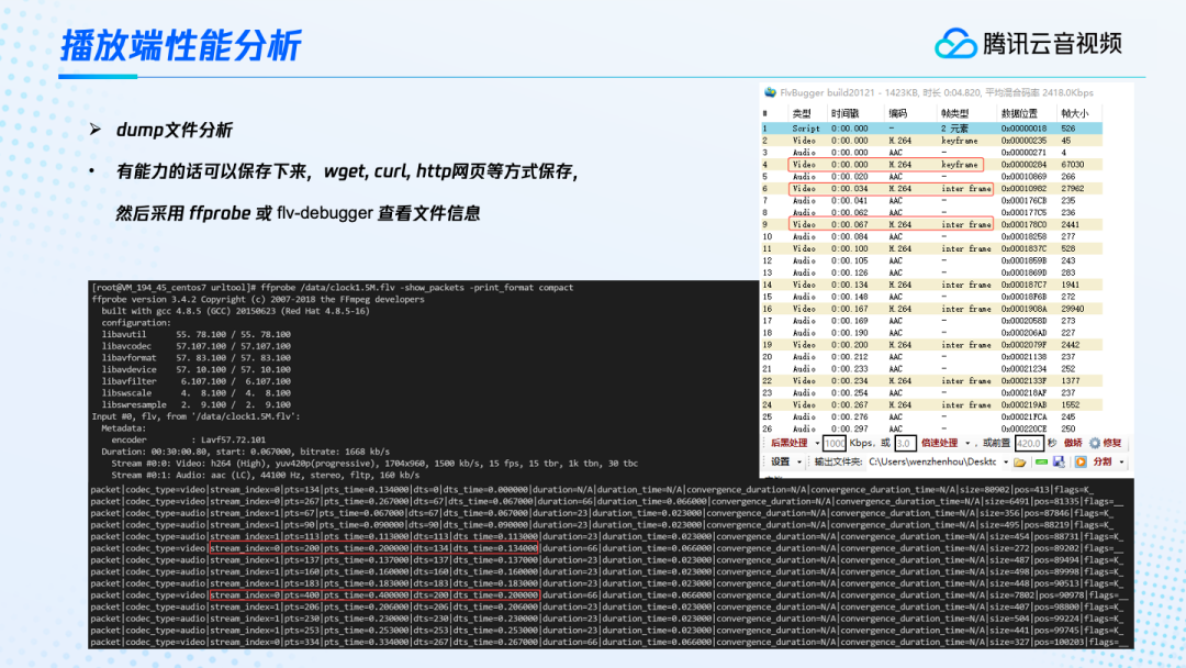 播放端除了设备以及网络的问题,可能也同样存在一些源流本身的问题。对于一些有能力的用户,我们建议通过wget 、curl、http网页等方式,将视频保存下来,之后辅助进行定位。有了这些文件,我们就可以用ffprobe或者是flv-debugger等工具来查看它的文件信息。比如用ffprobe来查看文件的信息,我们就都可以看到它的编码格式、分辨率以及码率帧率等情况。最主要的是还可以看到它每一帧的dts以及pts情况,还可以看到它的dts差值等等。这个流视频的dts差值一般在66,音频的话大概都在23,如果这个值均匀,没有回退等情况,那这个视频就是一个比较好的视频。在windows 端,也有FlvBugger 等等一些工具,可以辅助大家进行查看。它也可以很方便的看到每一个视频、音频的信息,甚至它的视频是不是关键帧,每帧的时间戳等信息,辅助大家去定位这个源流本身是否有问题。