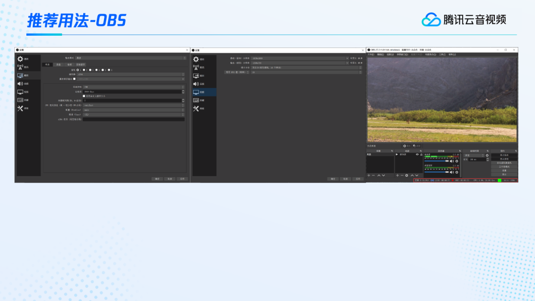首先我们介绍一下OBS,这是在PC端推流的一个非常常用的工具。在这个工具中,我们可以在推流之前对各选项做一些设置。输出模式直接选择高级,编码器推荐大家选X264,因为这个软件编码的适用性更好一些。如果你选了硬件编码,那可能不同的硬件设备编出来的音视频格式或内容会有一些差异。下面的码率控制,如果没什么特殊要求,建议选CBR就可以了,这样推出来会比较平稳的。比特率,也就是码率,没有特殊的要求的话,1Mbps到2Mbps就够了,在一些特殊的高清场景,可以再选大一些。关于关键帧间隔,也就是我们说的GOP的大小,一般在1-4秒就好,尽量不要超过4秒。如果超过4秒可能会在延迟、兼容性等方面出现小问题。一般没有特殊要求,推荐选2秒就可以。关于CPU的预设,选择默认的veryfast就可以了。配置profile 一般没什么要求,选择main profile或者baseline都是可以的。