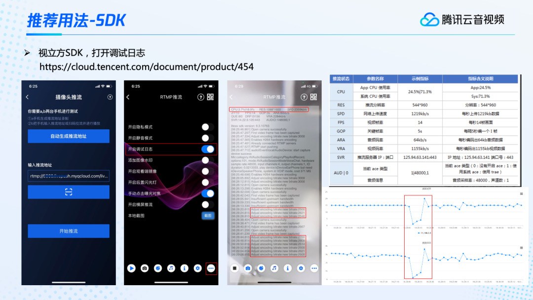 这里简单讲解一下推流方法。比如使用摄像头推流,这里直接把推流地址输入进去,然后点击开始推流就可以了。但是对有条件的用户,非常建议大家,尤其是在定位问题的时候,把右下角的配置打开,开启调试日志后再进行推流,可以看到非常详细的日志信息。比如说它可以显示当前CPU的情况。有APP的CPU,还有设备总的CPU。当然还有分辨率、码率等等的情况。上图右侧的这个表格,有每一个指标对应的含义。如果是集成SDK的话,SDK中也有回调函数,可以拿到实时的状态信息。在左边的图里面,有一个很关键的信息,我一开始预设的推流码率是3Mbps也就是3000kbps,但如果网络不行,就会出现提示insufficient upstream bandwidth,也就是上行带宽不足。上行带宽不足后,推流端会自适应降低码率,比如降成2.5Mbps的码率进行推流。之后有一段时间持续在2.5到2.9之间来回波动。