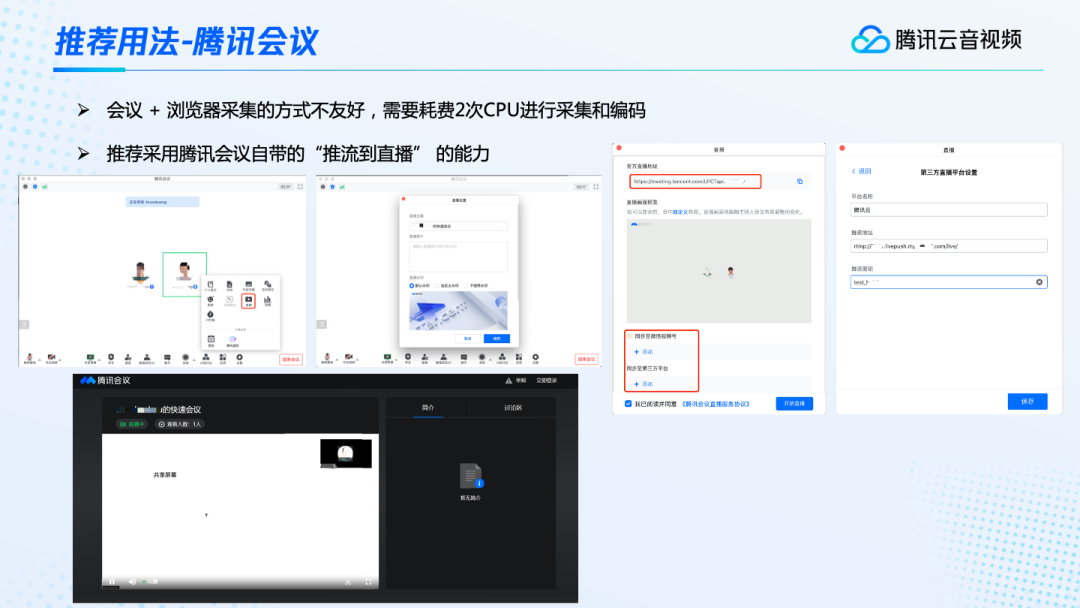 还有一个使用腾讯会议的场景,在有些情况下,用户可能不想让太多的观众进入会议,比如为了保持会议的稳定等等。但同时又想让很多人能够看到这场会议的直播。所以有的用户会在打开腾讯会议的同时,又打开浏览器,或者是OBS来采集画面进行推流。其实这种方式并不是特别的友好,因为它需要耗费两次CPU进行采集和编码。腾讯会议有一次采集和编码,浏览器或者OBS也要再次进行采集和编码,这样就需要耗费两次CPU。在这种场景,我们推荐采用腾讯会议自带的「推流到直播」的能力,直接推到云端,在会议的过程,点开设置里面的直播按钮就可以了。直播的时候,我们可以设置自己的主题或者是水印等等,还可以设置自己的推流地址。如果采用官方的直播地址,那可以直接开始推流,然后用官方直播地址就可以进行观看了。当然我们也可以推到视频号,或者其他第三方平台。假如要推到第三方平台,我们可以在这里将推流地址和推流密钥填上去,然后开始推流就可以了。