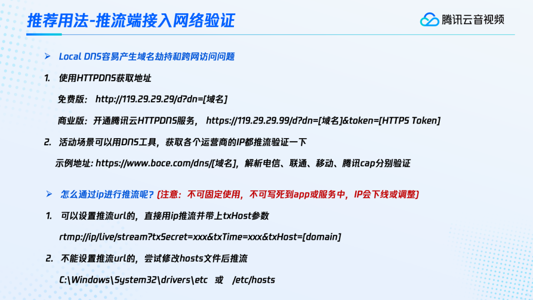 还有一些用户,因为活动很重要,想要确保不出问题,因此在推流之前想要验证一下推流端网络是否正常。这种时候怎样去避免因为localDNS产生的域名劫持和跨网访问的问题呢?我们可以采用HTTPDNS来获取地址。HTTPDNS 有一个免费的版本,但现在不推荐再使用了(官网已下线),建议使用商业版。商业版的话,我们可以开通腾讯云HTTPDNS的服务,就可以获取这个域名它对应的最优接入IP。这个腾讯云HTTPDNS的服务也非常便宜,几块钱就可以开通。如果不想用HTTPDNS的话,也可以自行搜索一些DNS的工具,获取各个运营商的IP都推流验证一下。
