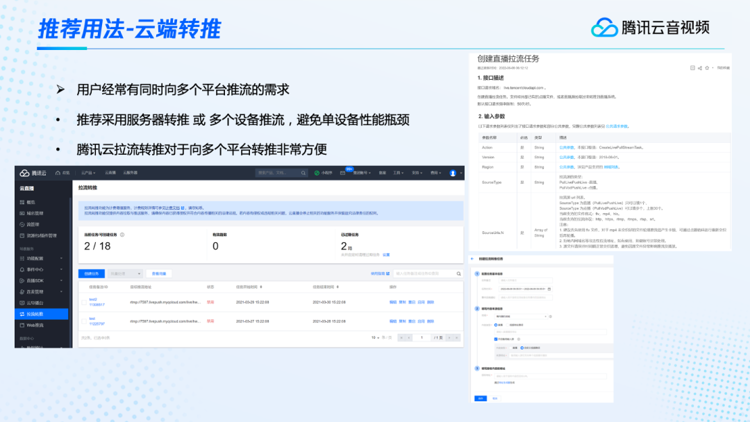 向多个平台进行推流也是很多用户的需求。因为现在的直播平台非常多,大家可能同时往多个平台进行推流。同时往多个平台推流,推荐的是采用服务器推流,或者采用多个设备推流,避免单设备的性能出现瓶颈。除此之外,还有一个非常好用的,就是使用云端转推的能力。比如说,使用腾讯云拉流转推的功能。它可以非常方便的向多个平台进行转推。当要添加一个转推任务时,在控制台点击创建任务就可以了。创建任务只需要填三个信息。一个是时间,这个任务的起止时间。一个是源流的地址,源流地址就是我先推一路流出来,推到一个平台,然后拿它的播放地址作为源流地址。第三个是目标地址,就是我要转推的其他平台地址。这三个信息一填,就可以非常方便的创建一个转推任务。而且它还规避掉了自己进行服务器转推或者设备推流的各种不稳定的问题。因为它具有自动容灾,任务异常自动拉起等功能。