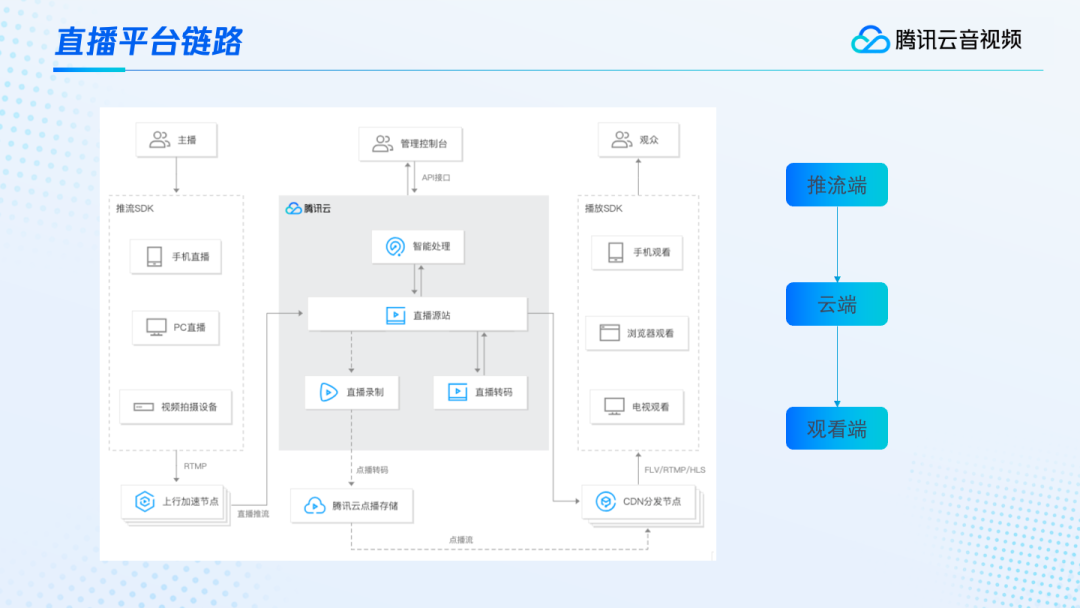 上图是我们整个直播平台的链路示意图。我们的主播在推流端,通过手机、PC或者是专业的视频拍摄设备进行推流。常规使用RTMP协议推流至服务端,也就是云端。云端进行智能处理、录制、转码等一系列操作后,通过CDN分发到全国甚至是全球各地的观众进行观看。这里的播放端包括手机、浏览器、电视等方式。简单总结的话,整个直播链路可以分成推流端、云端以及播放端三块。我们后面的内容,都会围绕这三端来进行展开。