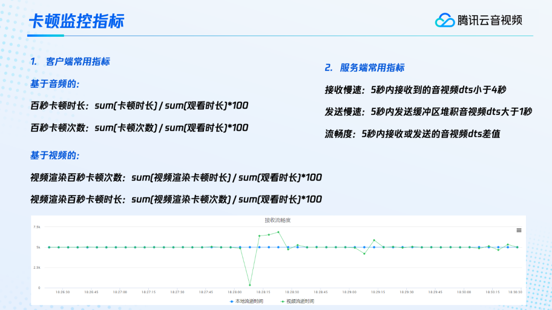 有了卡顿的定义,我们具体通过什么指标来统计卡顿的严重情况?业界常用的指标包括客户端的百秒卡顿时长、百秒卡顿次数、视频渲染百秒卡顿时长、视频渲染百秒卡顿次数以及服务端的接收慢速、发送慢速、流畅度。