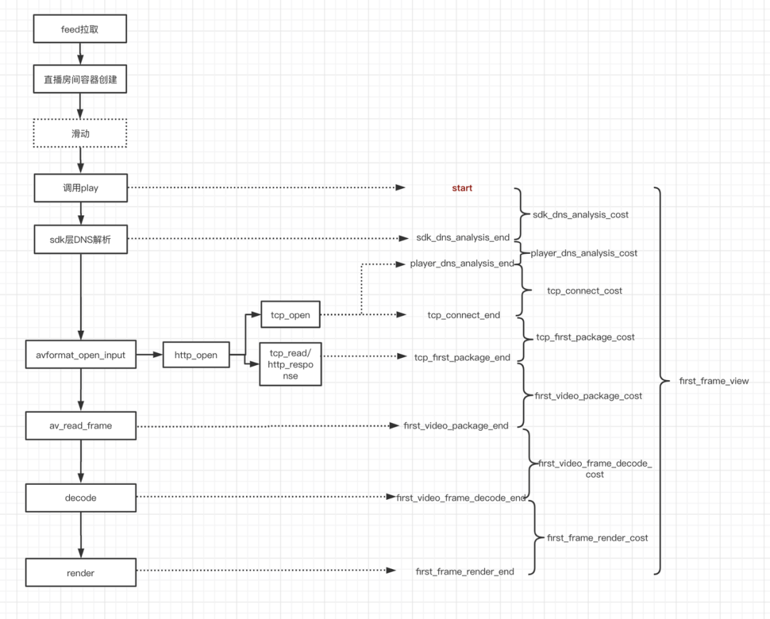 默认参数: max_analyze_duration = 5 * AV_TIME_BASE; //5s fps_probe_size = 20; // 20帧视频 max_probe_size = 1 << 20; // 1MB 优化参数: fps_probe_size = 3; // 3帧视频 - 视频首帧解码和视频首帧渲染:分别完成视频首帧解码和视频首帧渲染,优化的主要方向是 decoder 及 render 实例的预初始化等。