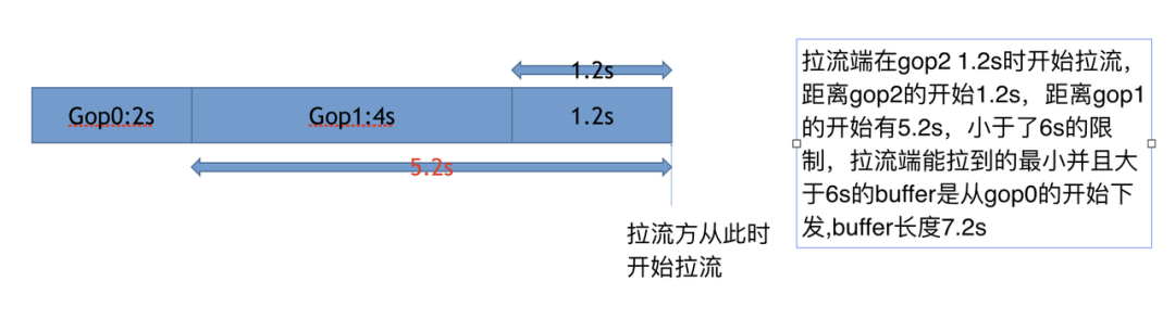 因此通过调节边缘节点的 GopCache 大小可以直接影响到链路上的端到端延迟。与此同时,Gop 的大小也会影响到不同用户之间的延迟差,在具体场景中就体现为两个观众的延迟存在差异(比如内购会别人看到主持人说了“3、2、1,开抢”,你才看到“3”),两名观众进入直播间的时间差即 使很短,但是延迟差可能达到一个 Gop(以下图为例,假设快启 buffer 下限为 1.3s ,用户分别在 1.2s 和 1.4s 进入直播间,延迟分别是多少?)。